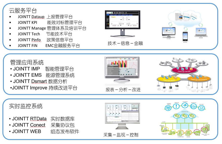接點(diǎn)智能工廠整體解決方案包括三個(gè)主要層級(jí)功能:實(shí)時(shí)監(jiān)控層、應(yīng)用分析層與云服務(wù)層,三層的主要功能架構(gòu)及技術(shù)產(chǎn)品如下圖: